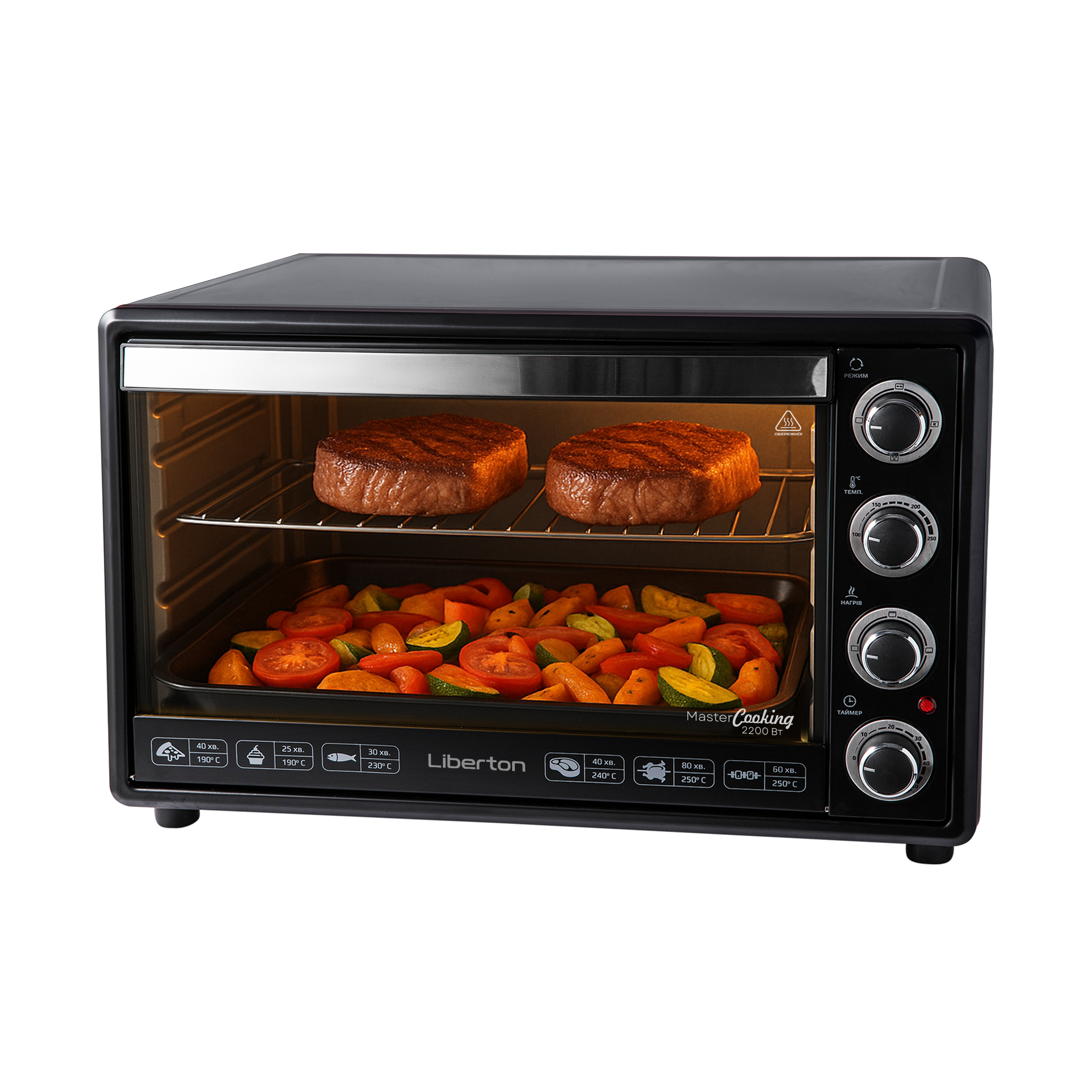Об'єм: 65 л; Висота внутрішньої камери: 32,5 см; Потужність: 2200 Вт; Термостат: 250 град.; Комплектація: решітка, прямокутне деко, кругле деко для піци, тримач для дека, рожен; Скло в дверцятах: 1; Режими приготування: 3; Конвекція; Підсвітка; Управління: механічне; Внутрішнє покриття: цинкове; Розмір виробу: 58,3x49,2x39,7 см; Колір: чорний.