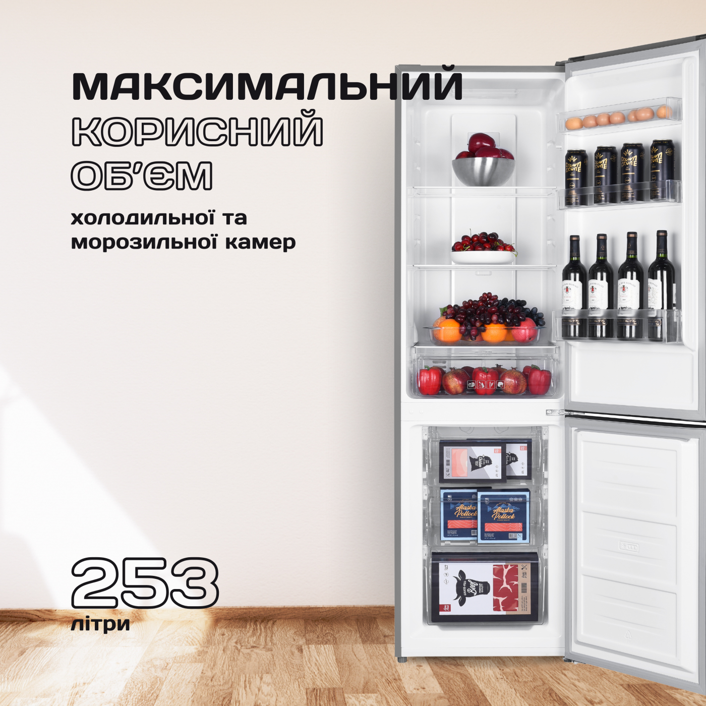 Загальний/корисний об'єм: 271/253 л; Загальний/корисний об'єм холодильної камери: 191/182 л; Загальний/корисний об'єм морозильної камери: 80/71 л; Клас енергоспоживання А +; Потужність: 90 Вт; Управління: механічне; Система розморожування: No Frost; Морозильна камера: нижня; Кіль-ть полиць в холодильній камері: 3 шт.(скло); Кіл-ть ящиків в морозильній камері: 3 шт.; Перенавішувані двері; Регульовані ніжки; Розмір виробу: 55х60х180 см; Колір: сірий+нержавіюча сталь.