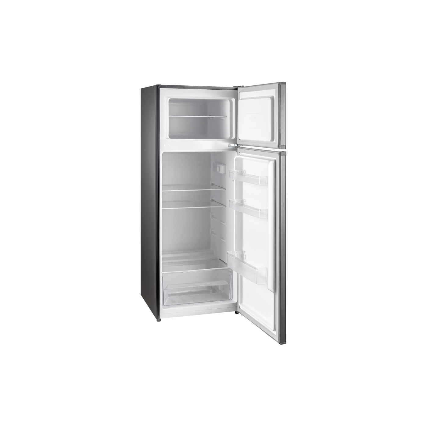 Загальний об'єм: 206 л. Корисний об'єм: 205 л. Система розморожування: ручна. Скляні лолиці: 3 шт. Пластикові полиці на дверцятах: 3 шт. Контейнер для овочів: 1 шт. Перенавішувані двері. Регулювання ніжок. Класс енергоспоживання: А+. Автономне зберігання заморозки: 20 год. Холодоагент: R600a. Розміри (ВхШхГ): 142,6х54,5х55 см. Колір: нерж. сталь + чорний. Гарантія: 2 роки.