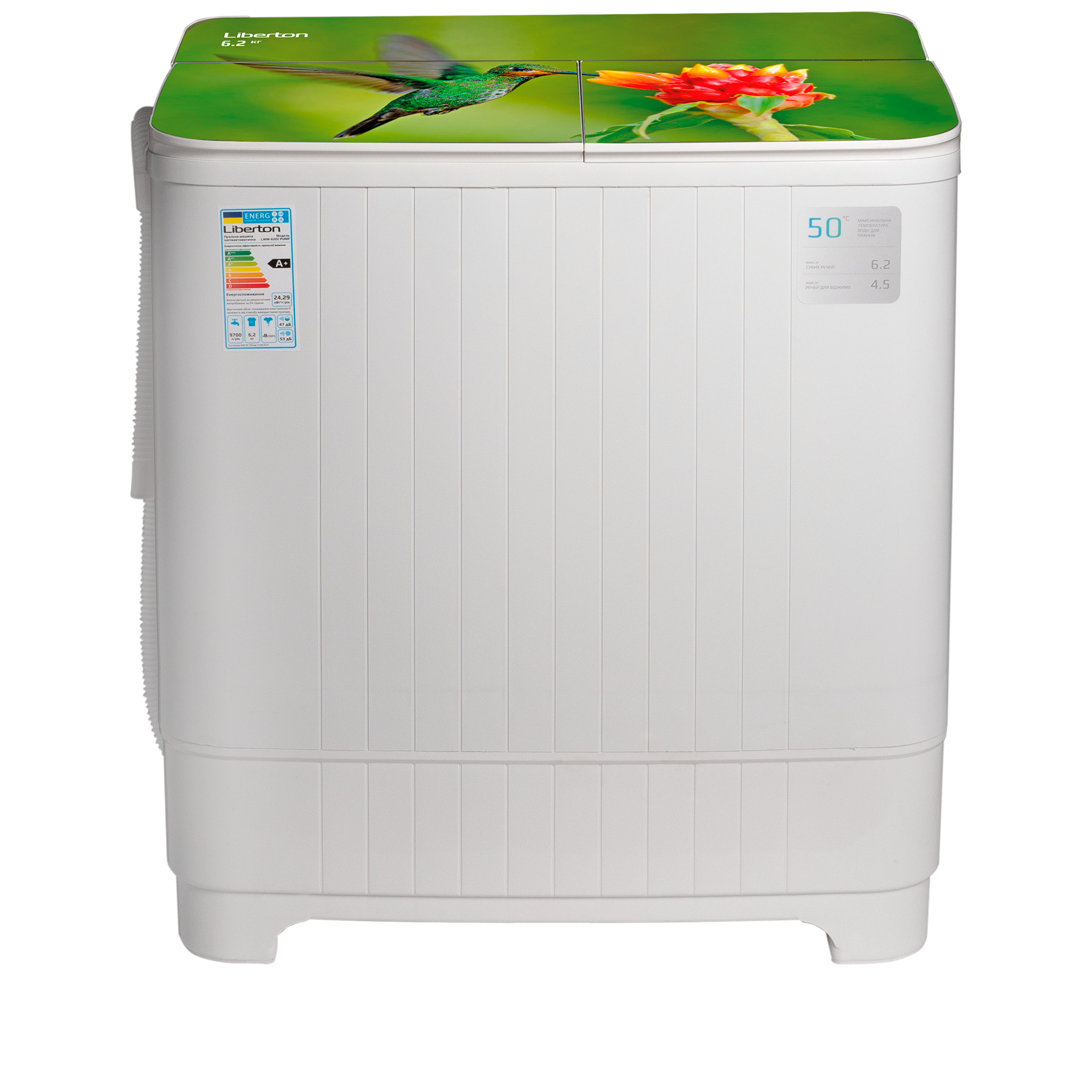Завантаження: 6,2 кг; Потужність: 380 Вт; Тип: напівавтомат, двобакова; Режими роботи: делікатне прання, стандартне прання, злив; Таймер: 15 хв .; Помпа для відкачування води; Центрифуга; Клас енергоспоживання: A; Рівень шуму: 53 дБ; Матеріал кришки: скло з принтом; Матеріал корпусу: пластик; Розмір виробу: 68х38х86 см; Колір: білий.