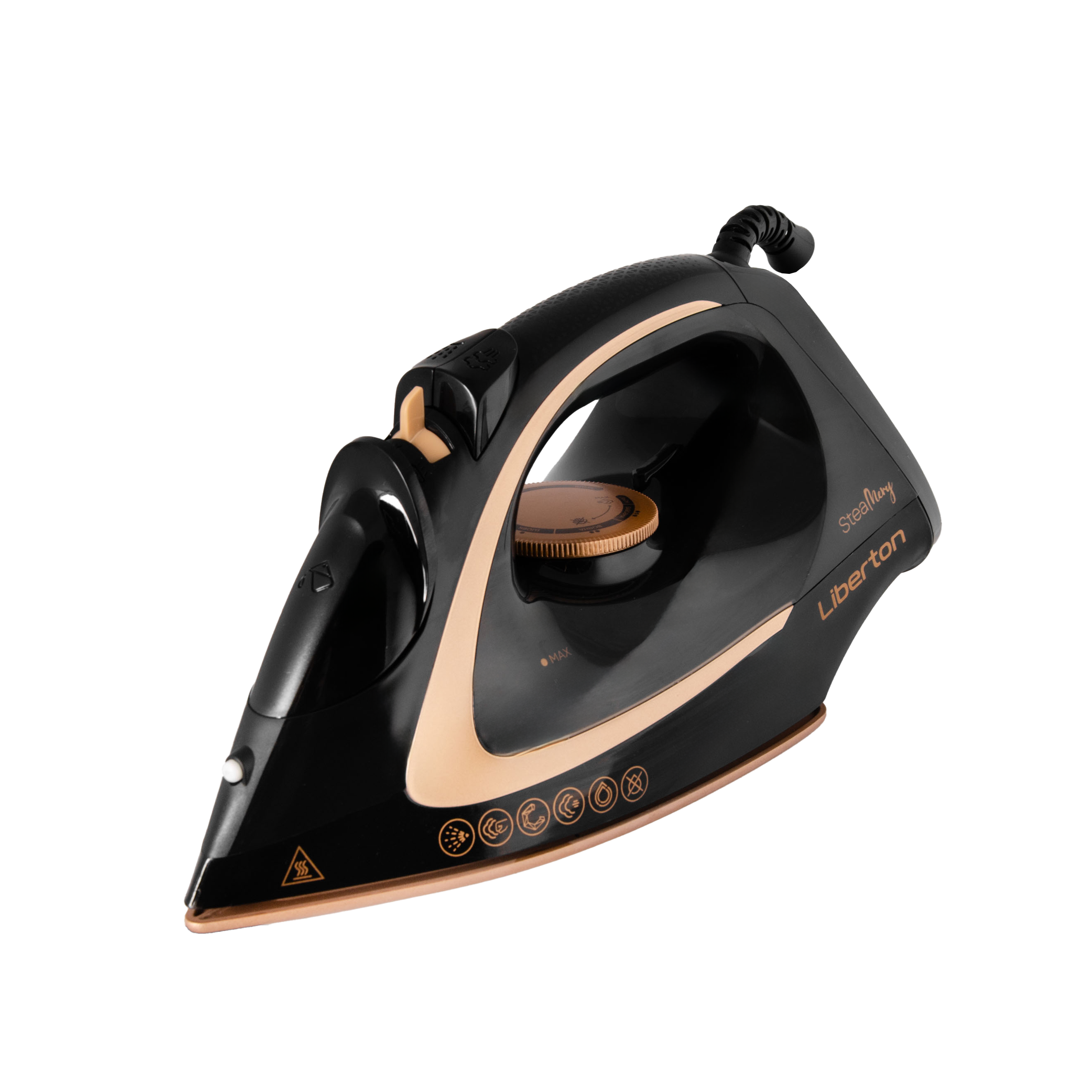 Потужність: 2200 Вт; Матеріал підошви: кераміка; Відпарювання: вертикальний пар, паровий носик, паровий удар, постійний пар, сухе прасування; Потужність постійного пара: 25-30 г/хв; Потужність парового удару: 110 г/хв; Об'єм резервуара для води: 300 мл; Додаткові функції: спрей, функція самоочищення, технологія "крапля-стоп"; Шарнірне кріплення шнура 360°; Мірний стакан; Довжина шнура: 2 м; Розмір підошви: 22,1x11,9 cм; Розмір виробу: 27,5х13,5х12,0 см; Матеріал корпусу: пластик; Колір: чорний+золото.