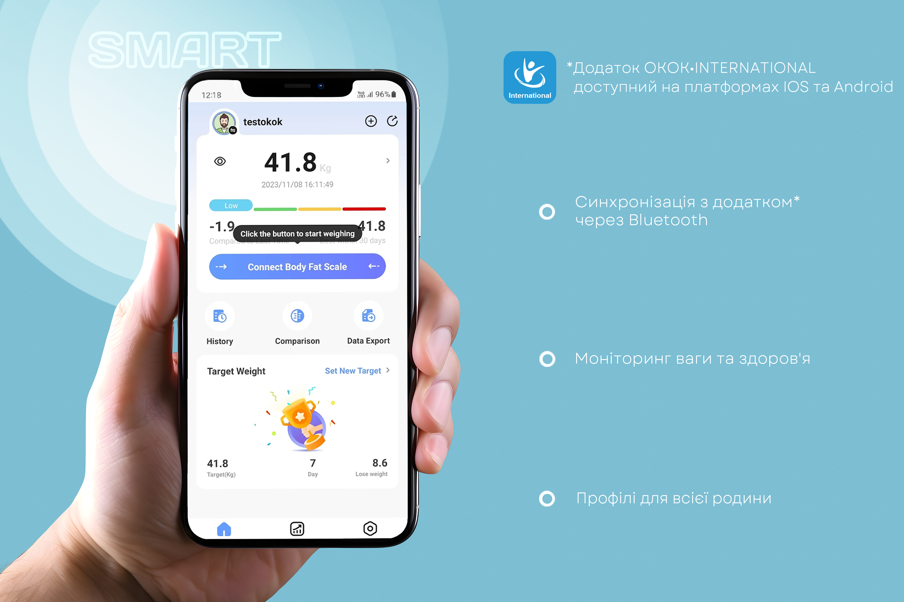 - Синхронізація з додатком OKOK·International: Особистий помічник у підтримці здоров'я та фітнесу.