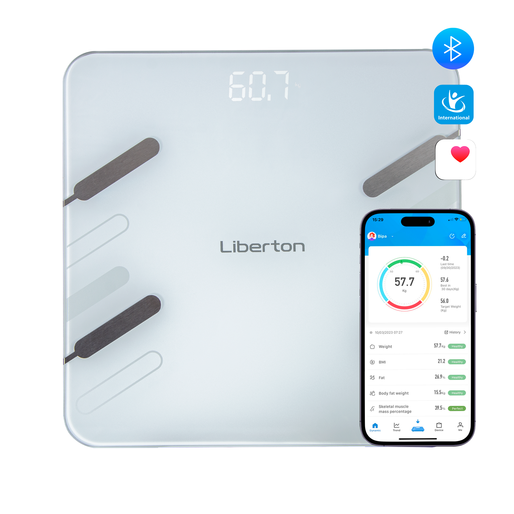 Наші смарт ваги Liberton LBS-0815 – ідеальний вибір для тих, хто прагне контролювати своє здоров'я та фігуру. Цей пристрій вимірює не лише вагу, а й надає детальну інформацію про стан вашого тіла, включаючи ІМТ, рівень жиру, м'язову масу та вміст води.