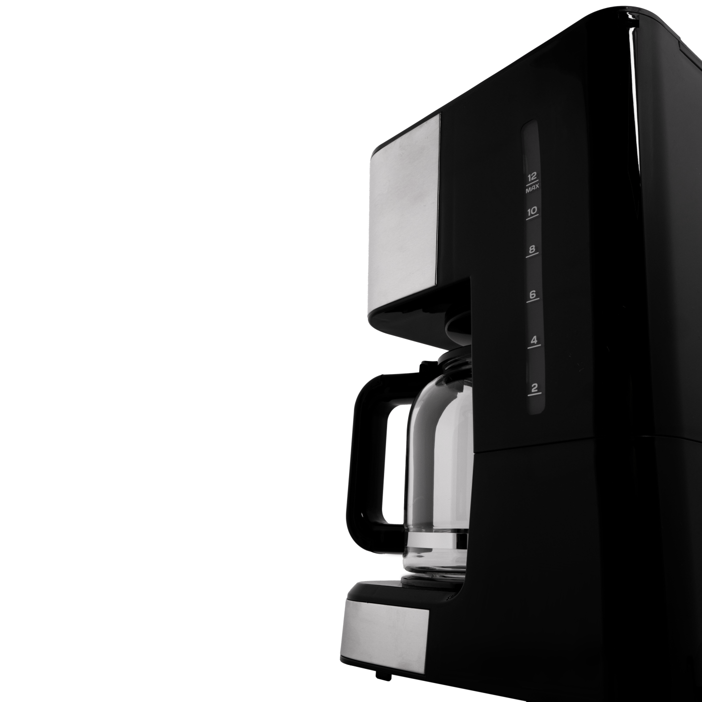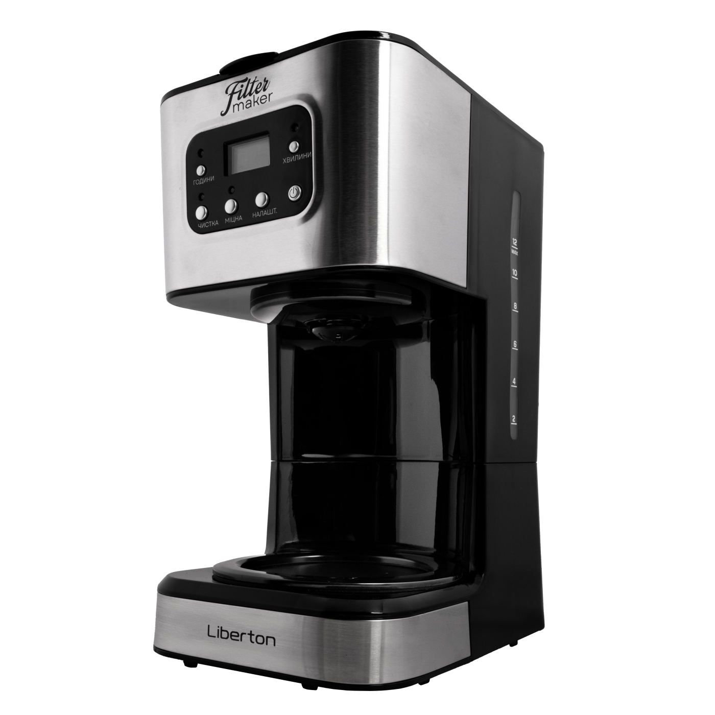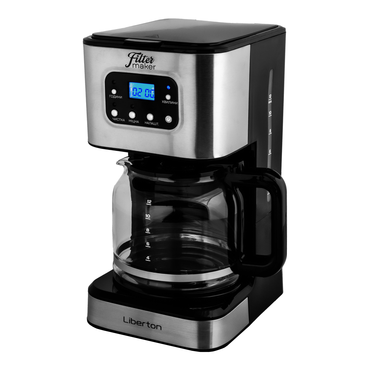 Тип кавоварки: крапельна; Потужність: 950 Вт; Тип управління: електронне; Ємність резервуара для води: 1,5 л; Кількість чашок готового напою: 12 шт.; Тип кави: мелена; Тип фільтра: багаторазовий; Особливості: регулювання міцності кави, автоматична підтримка температури, підігрівання кавника, автоматичне відключення, програма очистки, протикрапельна система, дисплей, годинник, таймер (24 години), захист від перегріву, індикатор увімкнення, індикатор рівня води, мірна ложка; Матеріал корпусу: пластик+нержавіюча сталь; Матеріал кавника: високотемпературне скло; Розмір виробу: 16,8х32,3х23 см; Колір: чорний+срібло.