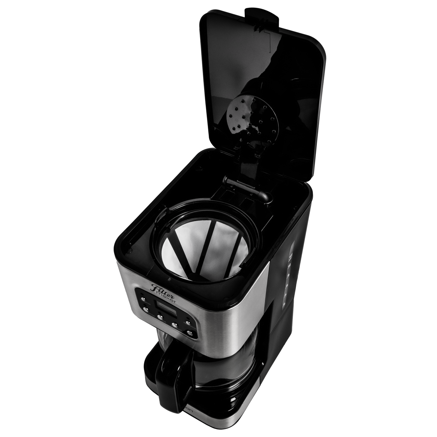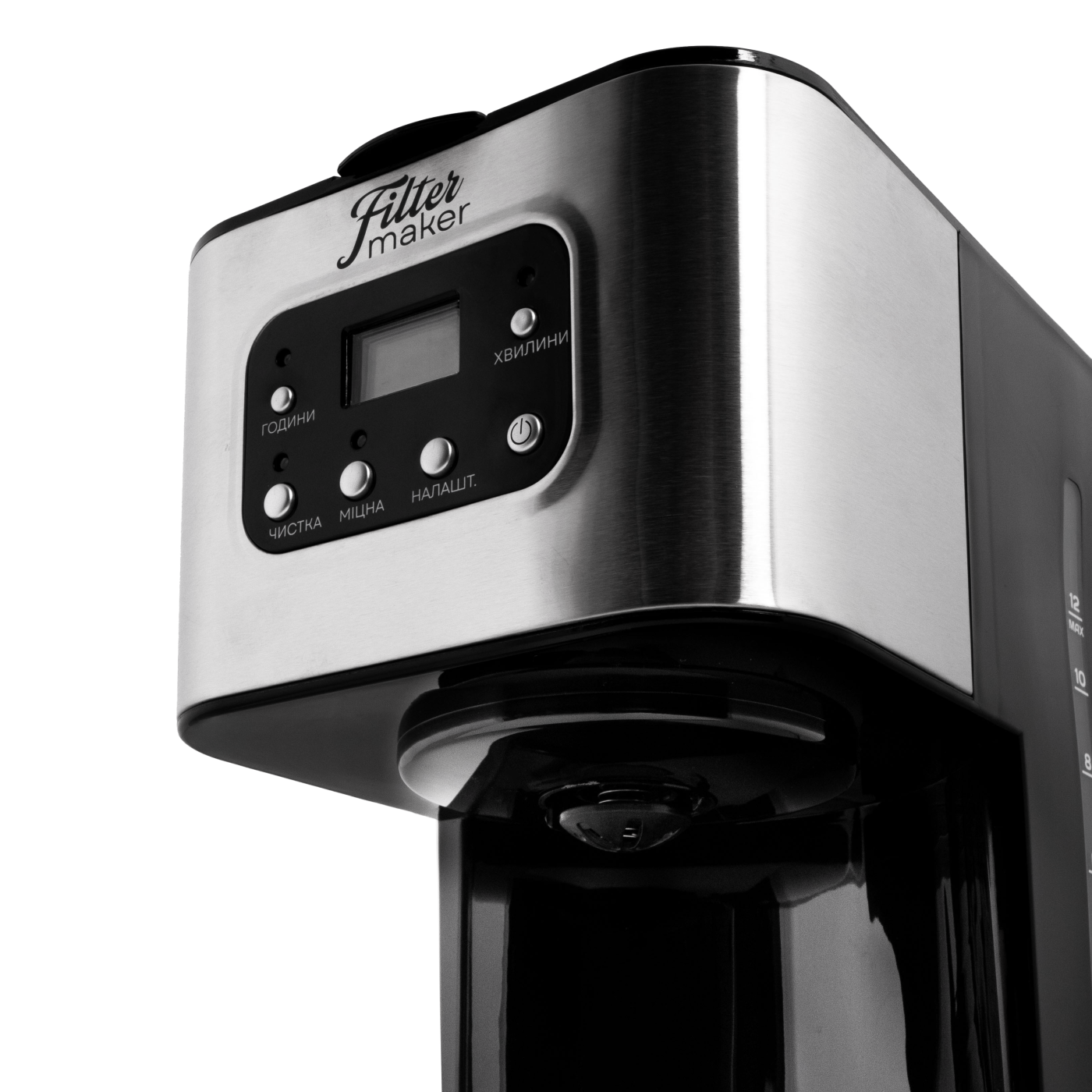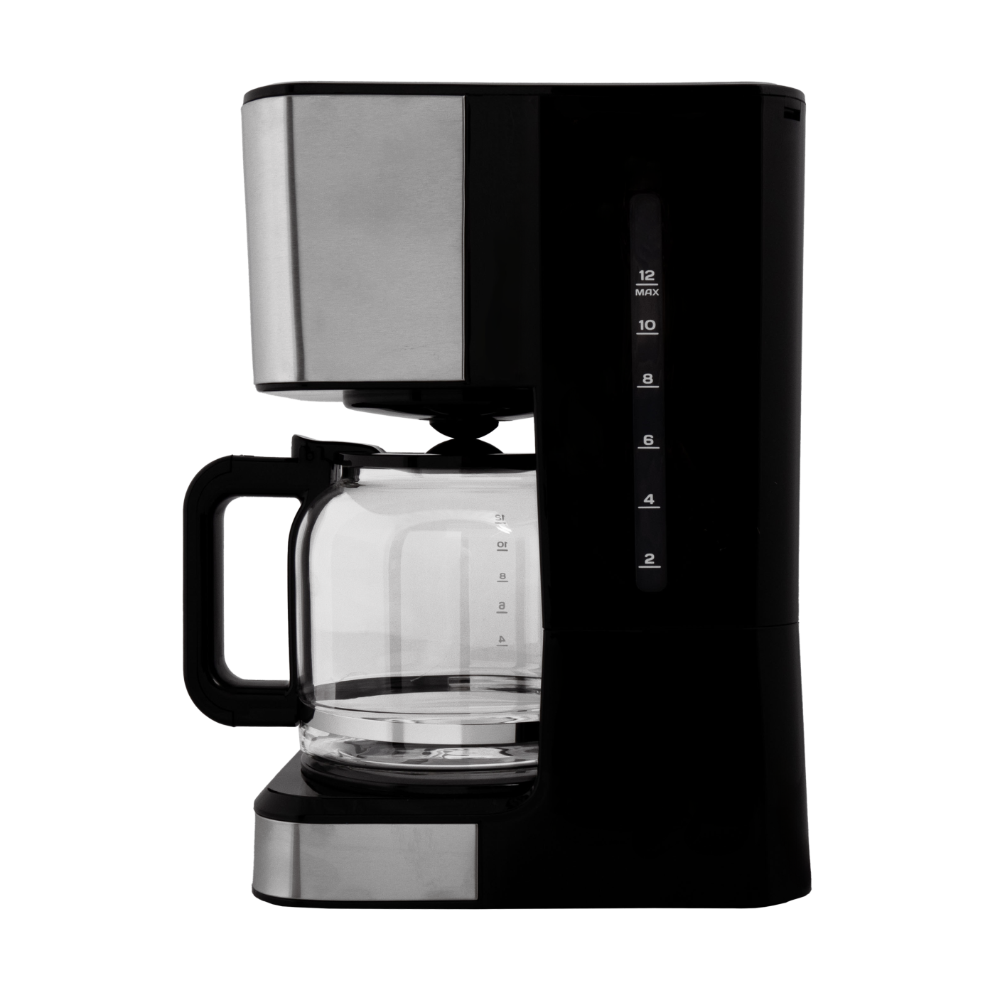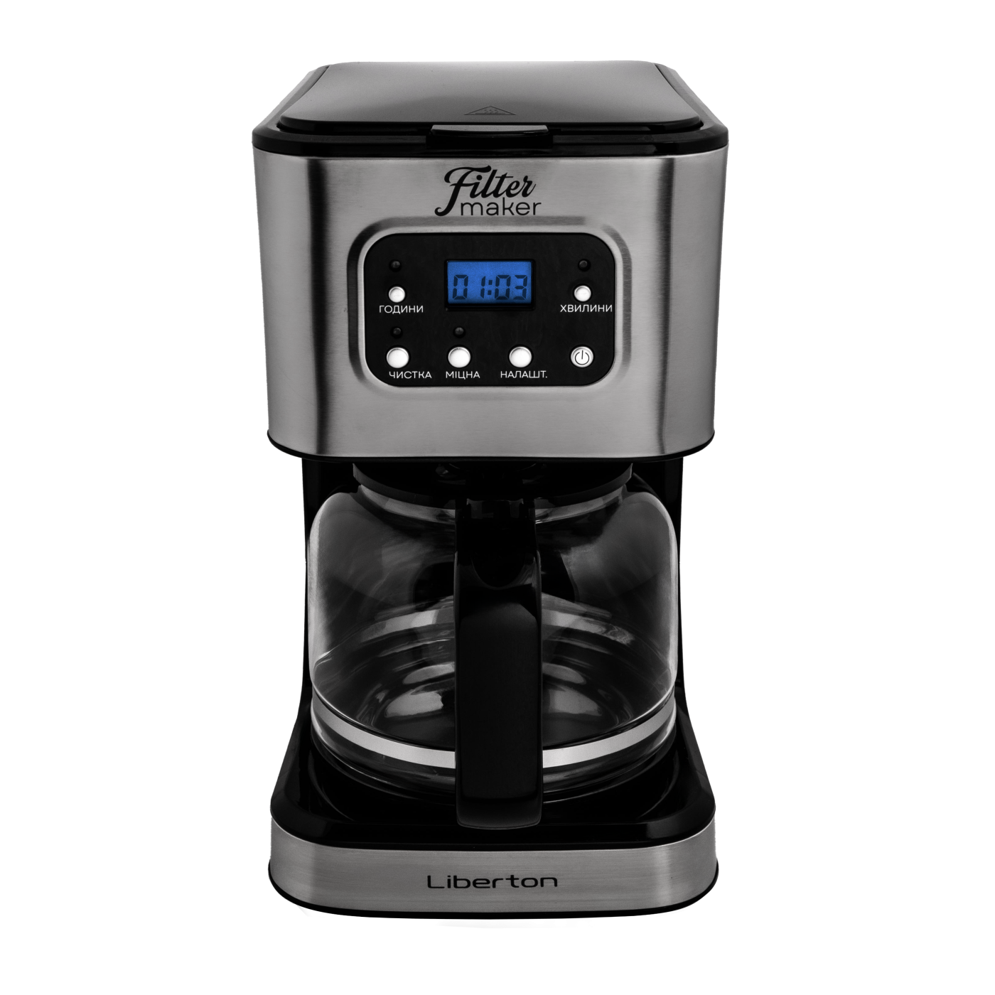 Тип кавоварки: крапельна; Потужність: 950 Вт; Тип управління: електронне; Ємність резервуара для води: 1,5 л; Кількість чашок готового напою: 12 шт.; Тип кави: мелена; Тип фільтра: багаторазовий; Особливості: регулювання міцності кави, автоматична підтримка температури, підігрівання кавника, автоматичне відключення, програма очистки, протикрапельна система, дисплей, годинник, таймер (24 години), захист від перегріву, індикатор увімкнення, індикатор рівня води, мірна ложка; Матеріал корпусу: пластик+нержавіюча сталь; Матеріал кавника: високотемпературне скло; Розмір виробу: 16,8х32,3х23 см; Колір: чорний+срібло.