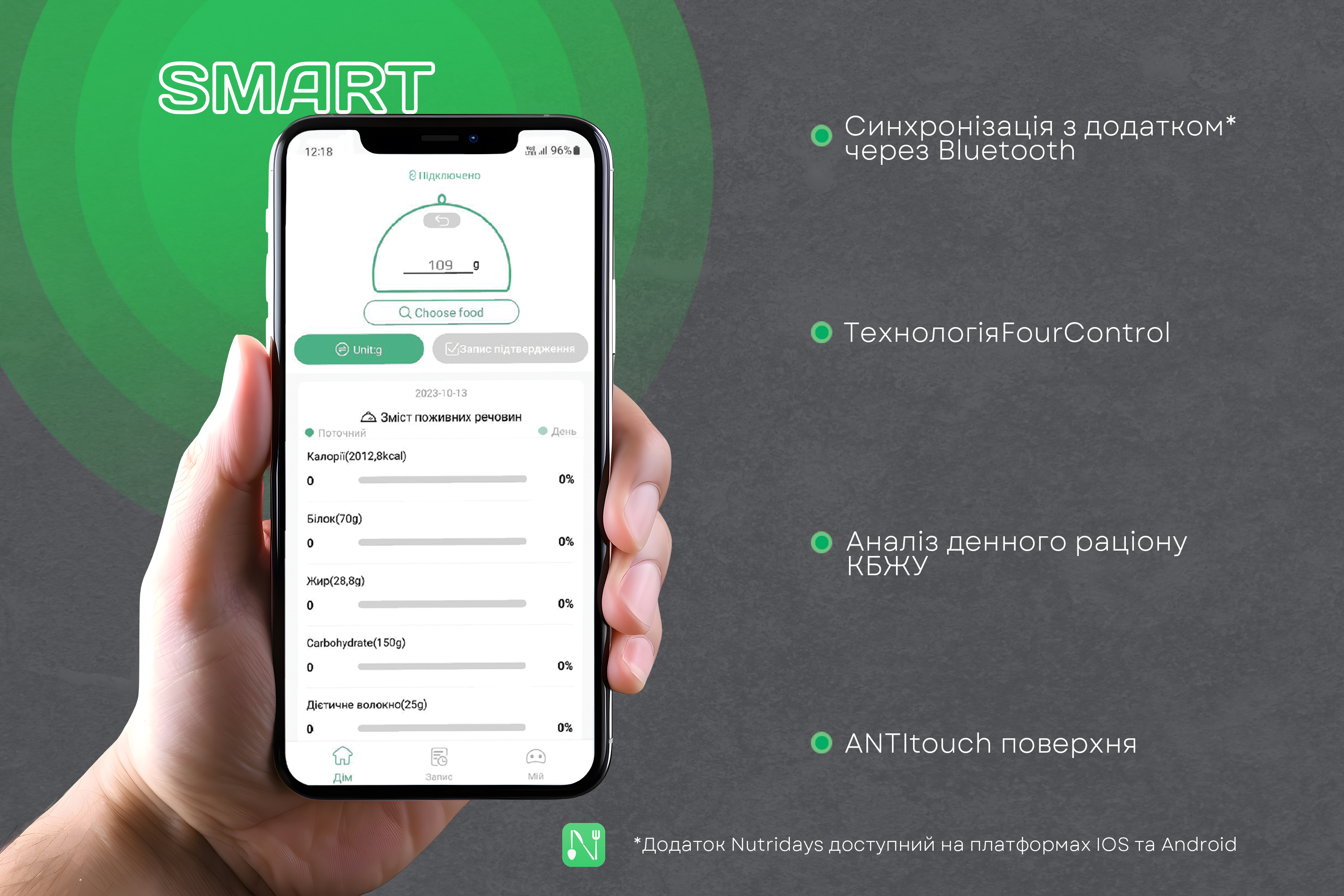• Щоденний звіт раціону: Nutridays база даних з понад 100 000 продуктів, яка постійно оновлюється.