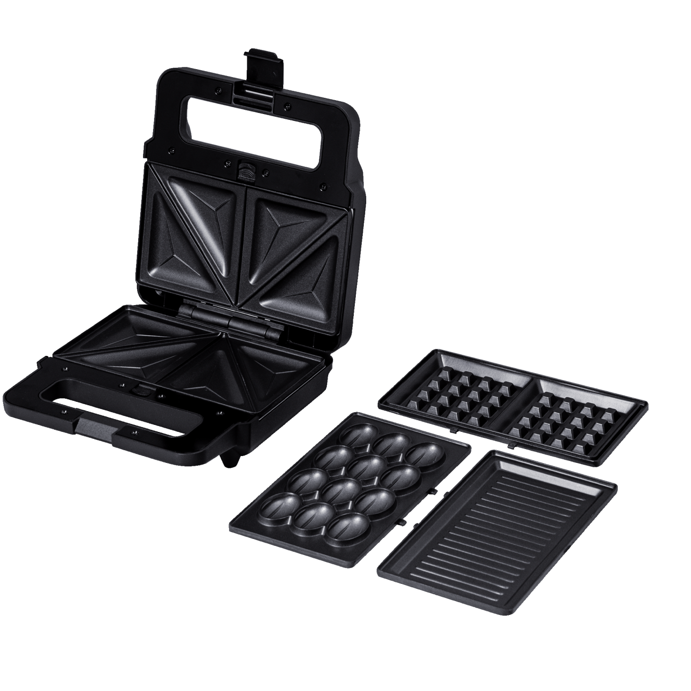 Потужність: 800 Вт; 4 в 1; Пластина: гриль, бельгійські вафлі (2 шт.), трикутні сендвічі (4 шт.), горішниця (12 шт.); Індикатор живлення і готовності їжі; Автоконтроль температури; Покриття пластин: антипригарне; Розмір робочої поверхні: 21,6х12 см; Матеріал корпусу: бакеліт; Розмір виробу: 22,1х9,3х23 см; Колір: чорний.