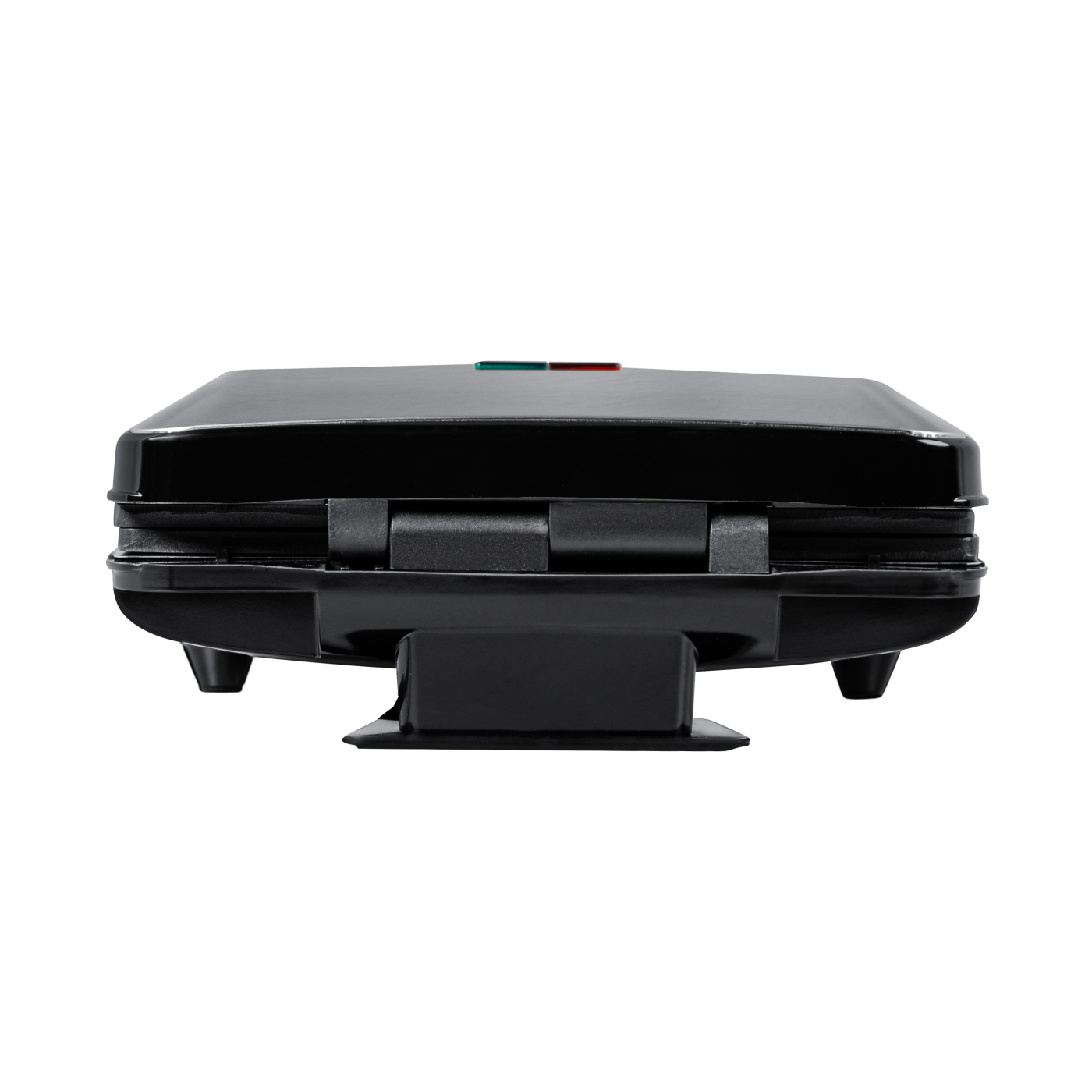 Потужність: 800 Вт; 4 в 1; Пластина: гриль, бельгійські вафлі (2 шт.), трикутні сендвічі (4 шт.), горішниця (12 шт.); Індикатор живлення і готовності їжі; Автоконтроль температури; Покриття пластин: антипригарне; Розмір робочої поверхні: 21,6х12 см; Матеріал корпусу: бакеліт+нержавіюча сталь; Розмір виробу: 22,4х8,8х22,2 см; Колір: чорний+нерж.